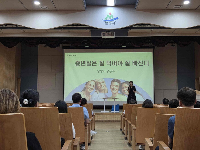 ※ 사진 설명(1~2): 밀양시청 대강당에서 22일 진행된 신중년 아르바이트사업 참여자 안전보건교육 모습