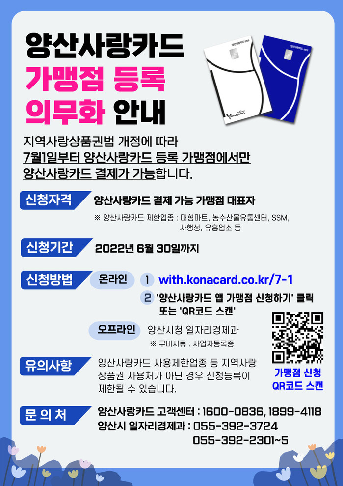 양산시는 2022. 6. 30.(목)까지 양산사랑카드 가맹점 집중등록기간을 운영한다고 밝혔다.