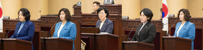 | ▲ 안산시의회가 17일 시정질문과 5분 자유발언을 실시했다. 사진 왼쪽부터 이날 시정질문과 5분 자유발언을 각각 실시한 김진숙 박은정 박은경 황은화 박은정 의원의 모습 /사진제공=안산시의회 |