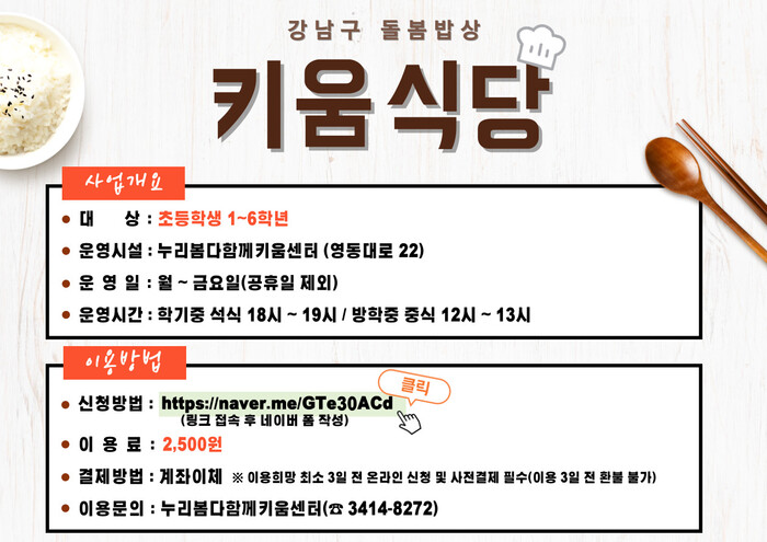[시민일보 = 이대우 기자] 서울 강남구(구청장 조성명)가 맞벌이·한부모 가정의 혼자 밥 먹는 아이들이 저렴한 가격으로 영양가 있는 저녁밥을 먹을 수 있는 ‘키움식당’을 이달부터 운영한다.