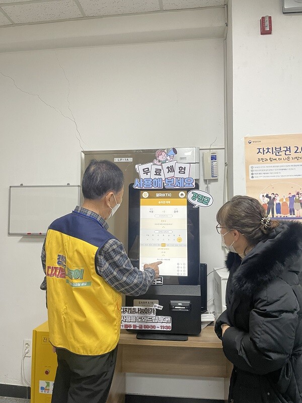 체험용 키오스크는 음식주문, 음료주문, 영화예매, 기차예매 등 다양한 체험을 실전처럼 연습해 볼 수 있도록 구성했으며, 일정 시간동안 강진디지털나눔이(지역활동가)를 배치해기기 사용을 돕고 있다.