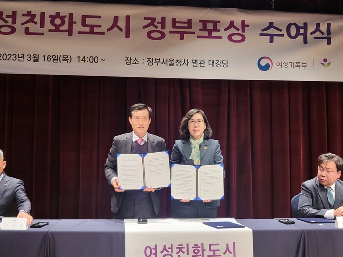 | ▲ 해남군, 16일 정부서울청사 별관 대강당에서 여성가족부로부터 여성친화도시 신규 지정 협약 체결 기념촬영 / 왼 쪽 김차진 해남부군수, 오른 쪽 김현숙 여성가족부 장관 / 해남군 제공 |