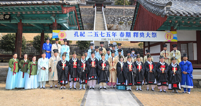 이번 춘기 석전은 초헌관에 조규일 진주시장, 아헌관에 최신용 진주시의회 부의장, 종헌관에 이외숙 진주교육지원청 교육장이 선임되어 경건한 분위기 속에서 성복, 인사, 집사분정표 낭독, 축사, 기념 촬영, 춘기 석전 봉행 순서로 진행됐다.