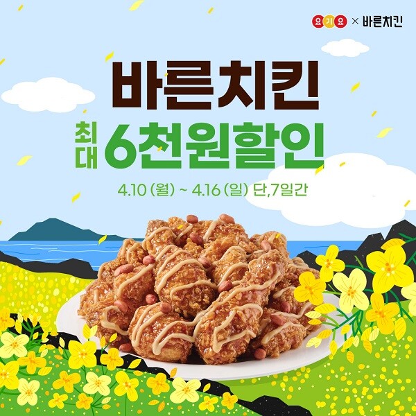 이번 프로모션은 나들이, 캠핑, 피크닉에 나서는 이들이 많아지는 4월 봄시즌을 맞아 요기요와 손잡고 준비한 특별 할인 이벤트다. 배달앱 요기요를 통해 바른치킨 주문 시 주문 금액에 따라 최대 6,000원 할인 혜택을 받을 수 있다는 것이 업체측 설명이다.