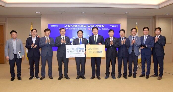 | ▲ 강기정 광주광역시장이 17일 오후 시청 비즈니스룸에서 오영훈 제주특별자치도지사와 고향사랑기부금 교차 기탁식을 한 후 기념촬영을 하고 있다. /광주광역시 제공 |