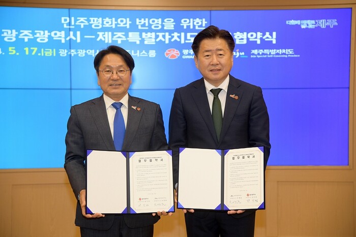 광주광역시와 제주특별자치도는 17일 오후 광주시청에서 강기정 시장과 오영훈 지사가 참석한 가운데 인권 평화와 번영을 위한 ‘상생발전 업무협약’을 체결했다.