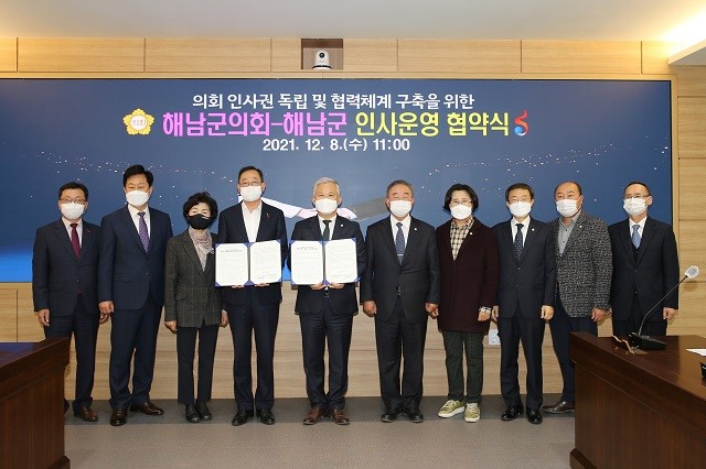 [해남=정찬남 기자] 전남 해남군의회(의장 김병덕)가 지난 8일 군청 상황실에서 해남군(군수 명현관)과 내년 1월부터 시행되는 해남군의회 인사권 독립의 안정적인 추진을 위해 인사운영 업무협약을 체결했다.