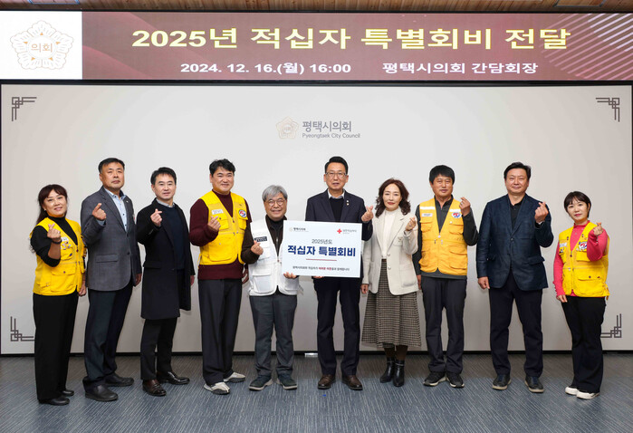 [평택=오왕석 기자] 평택시의회는 16일, 의회 3층 간담회장에서 대한적십자사 경기도지사에 2025년 적십자 특별회비 전달식을 가지고 이웃에 따뜻한 온기를 전했다.