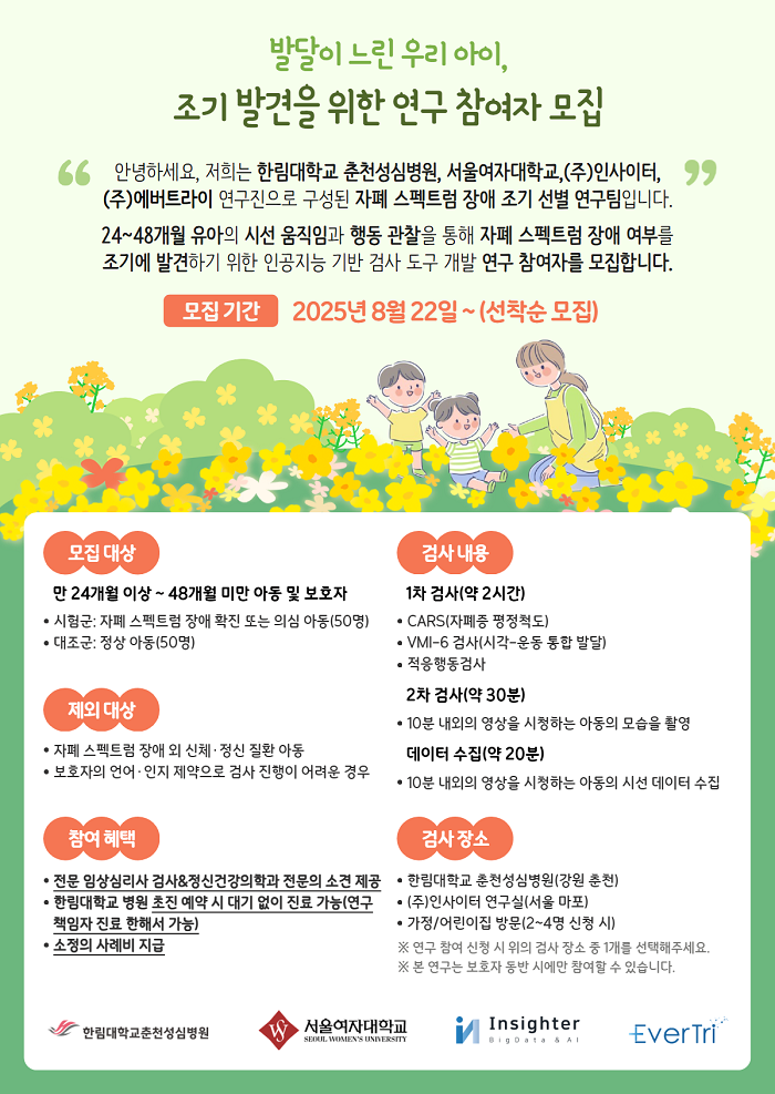 의학적 검증과 인허가 준비도 순조롭게 진행 중이다. 한림대학교 춘천성심병원 정신건강의학과는 임상 데이터 수집 및 유효성 검증을 담당하며, 현재 IRB 승인을 마치고 영유아 대상 임상을 진행하고 있다. 임상시험수탁기관(CRO) 에버트라이는 이를 바탕으로 의료기기 인허가 전략 수립을 지원하고 있으며, 서울여자대학교는 기술 검토 및 자문 역할을 수행하고 있다.
