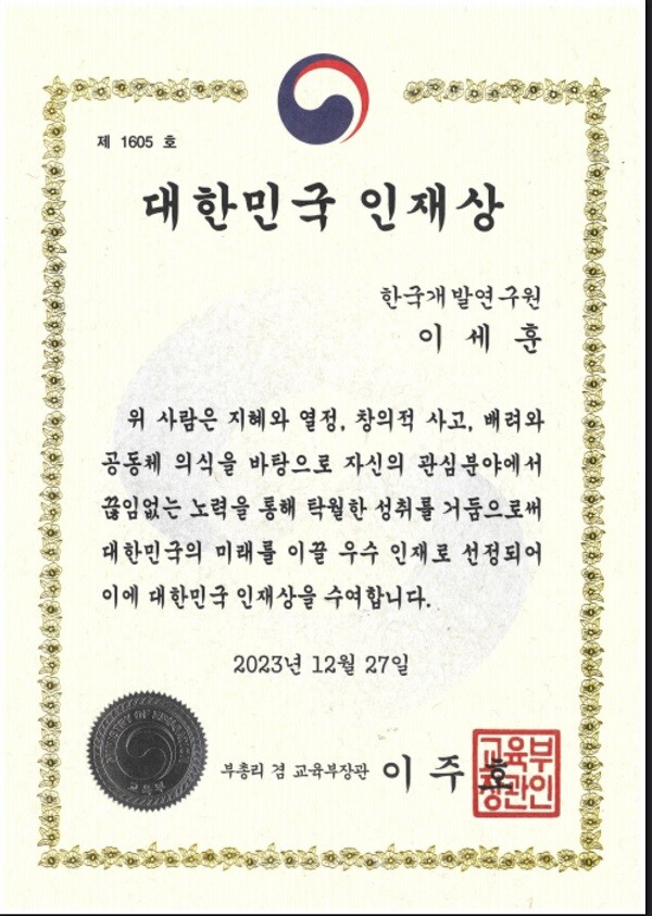 KDI국제정책대학원(원장 유종일, 이하 KDI대학원)은 정책학 석사과정에 재학중인 이세훈 학생이 ‘2023년 대한민국 인재상 시상’에서 ‘2023 대한민국 인재상(부총리 겸 교육부장관상)’을 수상했다고 밝혔다.