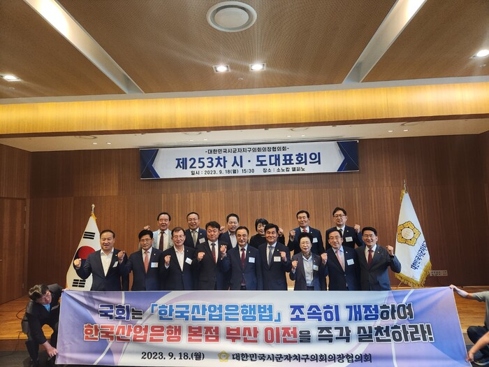 | ▲ 한국산업은행 본점 부산 이전 촉구 결의안을 채택한 의원들이 기념촬영을 하고 있다. (사진=수원시의회 제공) |