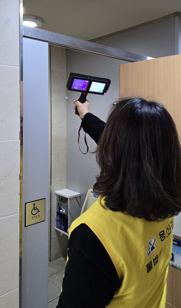 | ▲ 공중화장실 불법 촬영 탐지기 확인 모습. (사진=용산구청 제공) |