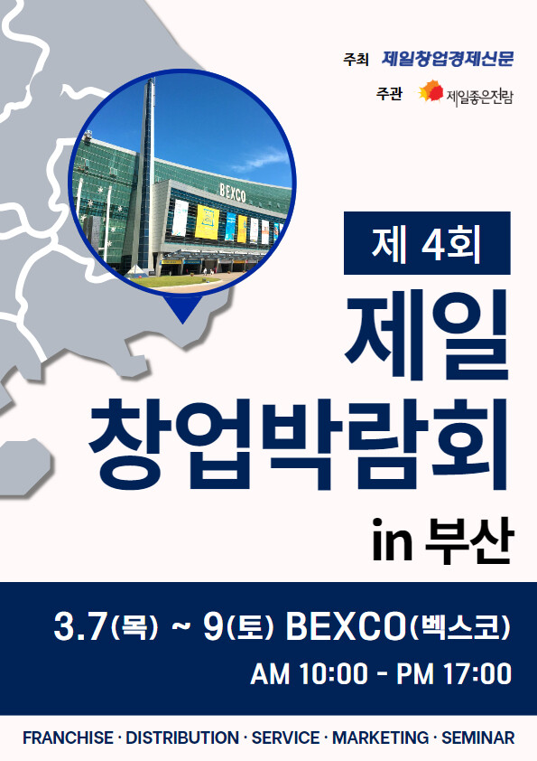 ‘제일창업박람회in 부산’는 3일간 벡스코에서 진행되며, 행사 전날인 3월 6일까지 제일좋은전람 홈페이지에서 사전등록 후 무료 관람할 수 있다.