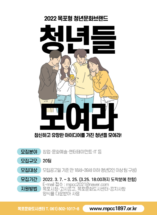 목포시가 청년이 주도하고 참여하는 청년문화 콘텐츠 개발을 통해 지역 활력 증진과 지속가능한 일자리 창출을 도모하는 ‘2022년 목포형 청년문화브랜드 사업’의 청년문화(창업)활동가를 모집한다.