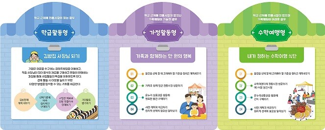 이 자료집은 ▲학급별로 인근 전통시장을 방문하는 ‘학급활동형’ ▲가족과 함께 전통시장을 방문하는 ‘가정활동형’ ▲현장 체험활동 시 전통시장을 방문하는 ‘수학여행형’ 등 3개 유형으로 이뤄졌다.