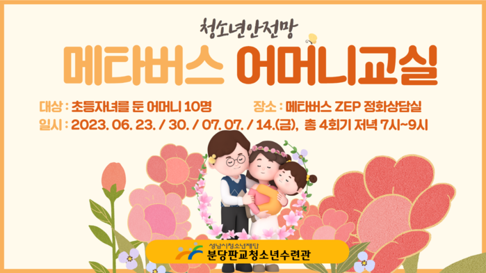 이번 [메타버스 타 go, 상담해 yo!]‘어머니교실’은 지난 5~6월, 4회기에 걸쳐 진행된 ‘메타버스 아버지 교실’에 이어 기획되었으며, 남진우 임상심리사가 교육을 진행한다. 진행은 메타버스 정화상담실에서 비대면으로 진행된다.