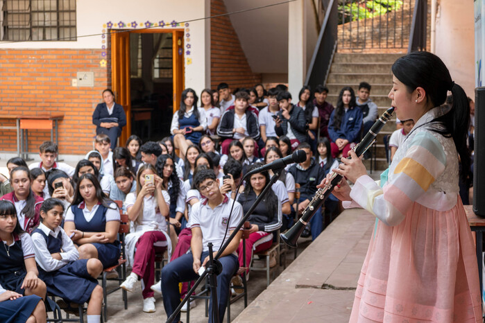 | ▲ 파라과이 유은혜 단원이 현지 청소년들 앞에서 클라리넷 연주를 하고 있다. Ⓒ IYF |