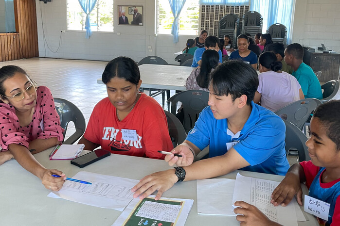 | ▲ 피지 이진혁 단원이 현지 학생들에게 한국어를 가르치고 있다. Ⓒ IYF |