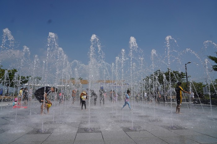 | ▲ 지난 7월 초 해남군 황산면 소재 고천암자연생태공원을 찾은 어린이들과 가족 등이 바닥에서 분출된 물줄기를 즐기고 있다. / 사진ㄴ=해남군 제공 |