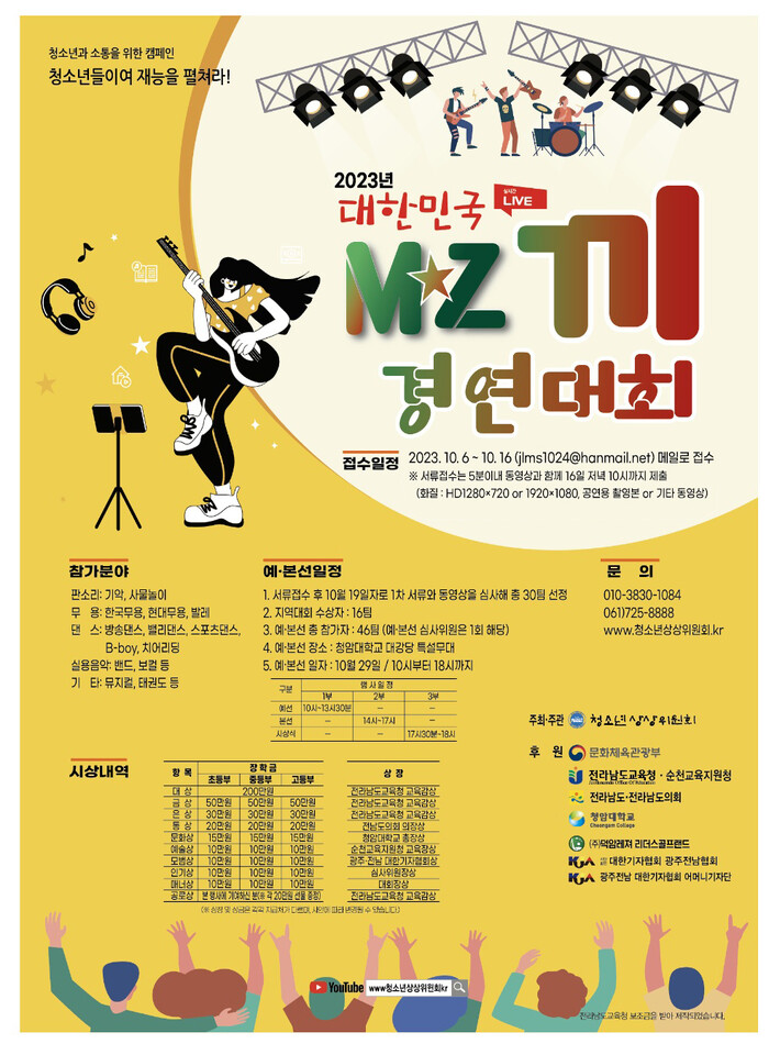 전남 순천 청소년상상위원회(대회장 이상대)가 오는 29일 청암대학교 대강당 특설무대에서 전국 24세 이하 청소년을 대상으로 ‘2023년 대한민국 MZ 끼 경연대회’를 개최한다.