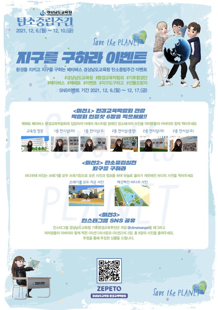 학생들은 메타버스로 구현한 경남교육청 환경교육박람회를 관람하고, ‘지구를 구하라’라는 임무를 완수하면 푸짐한 상품도 받는 이벤트에 참여할 수 있다.