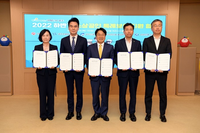 협약식에는 강기정 시장, 변정섭 광주신용보증재단 이사장, 이우경 광주은행부행장, 박기례 KB국민은행 광주지역본부장, 박종효 신한은행 광주커뮤니티 단장 등이 참석했다. 이들은 출연금 및 사업비 지원 등을 통해 하반기 소상공인 특례보증 지원사업의 원활한 추진을 위해 상호협력하기로 했다.