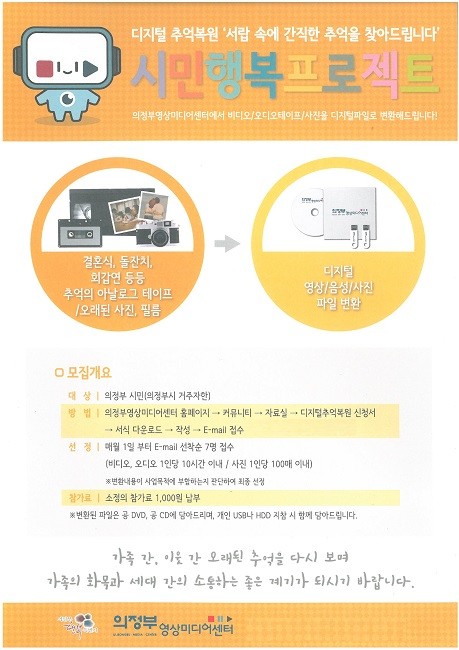 미디어 매체가 디지털로 변화하여, 가정에서 보유하고 있는 옛날 아나로그 방식의 테이프를 재생할 수 있는 방법이 없어 서랍이나 장롱에 자리만 차지하고 있는 신세가 되어 버렸다. 이에 시민들이 추억을 되새기며 영상물을 수시로 관람할 수 있도록 테이프를 디지털 파일로 변환해 주는 서비스다. 특히 옛날 사진을 두꺼운 양장 앨범에 보관만 하여 꺼내 보기도 힘들고 빛이 바라고 훼손되어 사실상 가정에 큰 짐이 되어 방치하고 있는 게 현실이다. 이러한 옛날 사진들과 필름을 디지털 파일로 변환해주는 서비스도 2023년부터 실시한다.