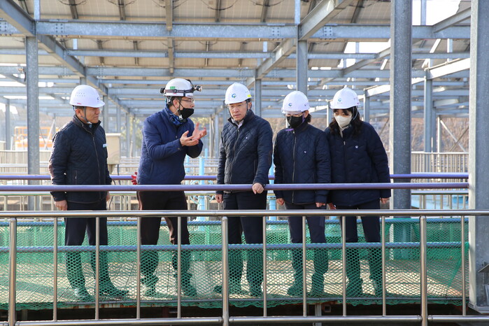 | ▲ 김성환 광주환경공단이사장(가운데)이 제1하수처리장 현장점검을 하고 있다. / 광주환경공단 제공 |