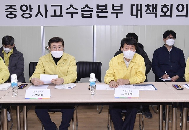 [광주=정찬남 기자] 이용섭 광주광역시장이 안경덕 고용노동부 장관(중앙사고수습본부장)과 24일 오후 현대산업개발 아파트 신축공사 붕괴사고 중앙사고수습본부 대책회의에 참석해 수색 및 구조 계획 지원 방안 등을 논의하고 있다.