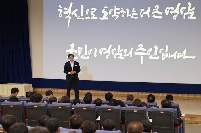 | ▲ 우승희 영암군수가 1일 8월 정례조회에서 직접 제작한 PPT 자료를 활용해 “혁신으로 도약하는 더 큰 영암! 군민이 영암의 주인입니다”라는 주제로 브리핑을 하고 있다. / 영암군 제공 |