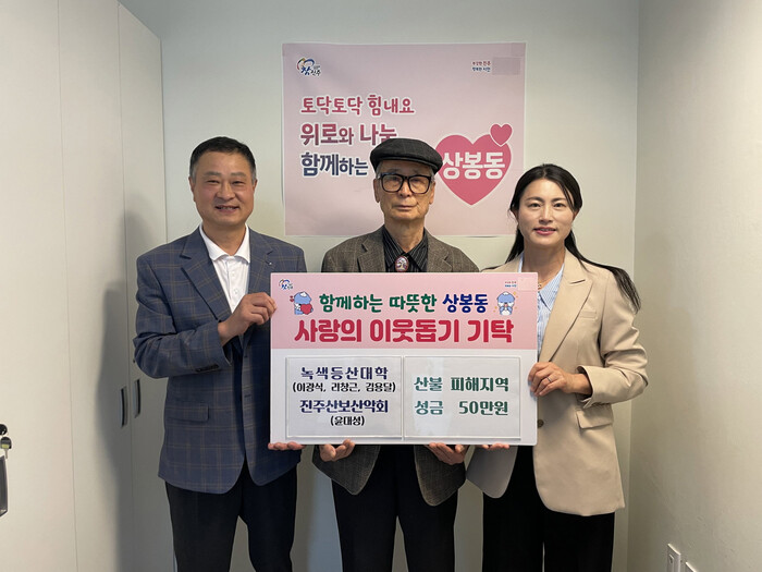 진주시 상봉동 행정복지센터는 16일 녹색등산대학(학장 이광식)과 진주산보산악회(회장 윤대성)에서 영남지역 산불피해 복구를 위해 현금 50만 원을 기탁했다고 밝혔다.