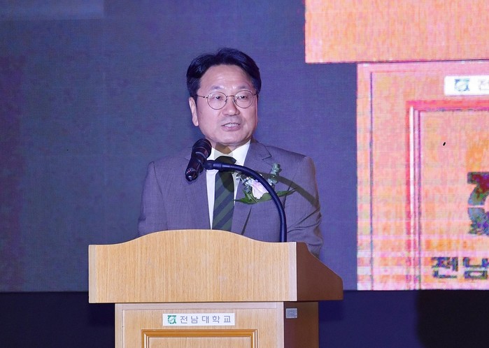 [광주=정찬남 기자] 강기정 광주광역시장이 5일 오후 북구 전남대학교 국제회의동 용봉홀에서 열린 '하이브리드 파워팩 전주기 관리 특화연구센터 개소식'에 참석해 축사를 하고 있다./광주광역시 제공