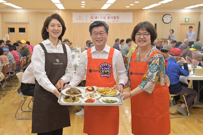 파라다이스그룹과 파라다이스복지재단에서도 22일 유락종합사회복지관 경로식당에서 어르신 100명을 모시고 설렁탕, 모듬전, 잡채 등 명절 음식을 대접했다.
