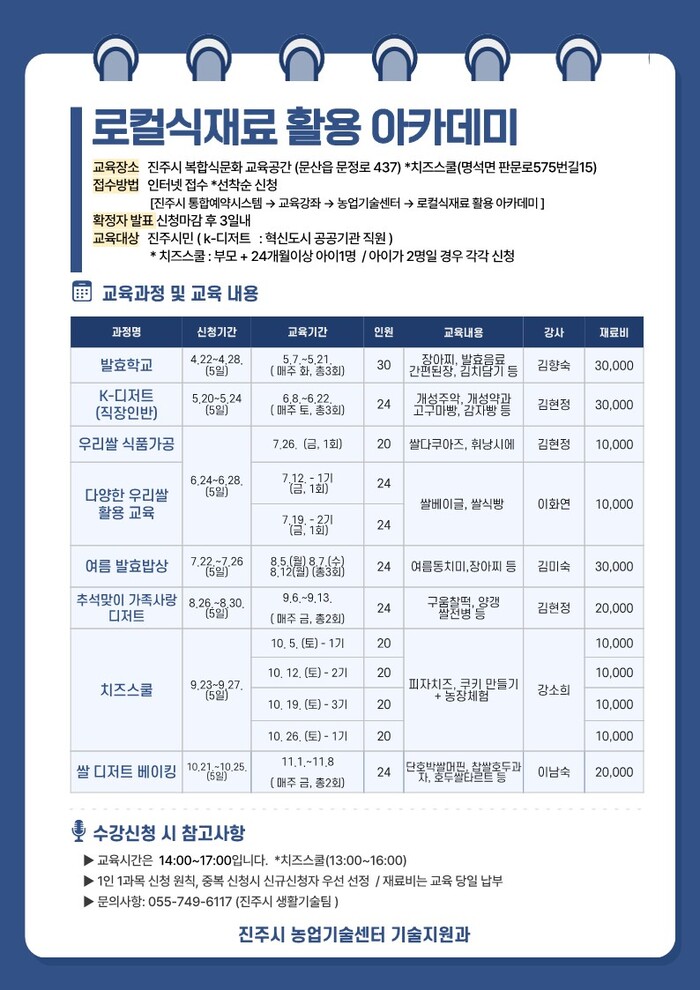 과정별 20~30명을 모집하며 진주시 홈페이지 분야별정보란에서 확인할 수 있다. 기타 자세한 사항은 농업기술센터 기술지원과 생활기술팀(055-749-6117)로 문의하면 된다.
