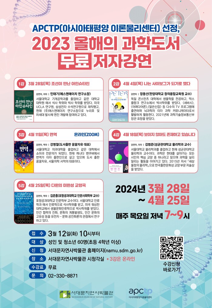 주제는 APCTP(아시아태평양 이론물리센터)에서 선정한 ‘2023 올해의 과학책’으로, 해당 과학도서 5권의 저자, 번역자, 관련 전문가가 강연한다.