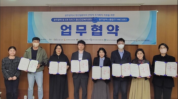 [광주=정찬남 기자] 광주광역시(시장 강기정)는 26일 광역정신건강복지센터 회의실에서 광주광역정신건강복지센터, 5개 자치구 정신건강복지센터, 광주종합주거복지센터와 ‘광주지역 정신질환자의 안정적 주거복지 지원을 위한 협약’을 체결했다.