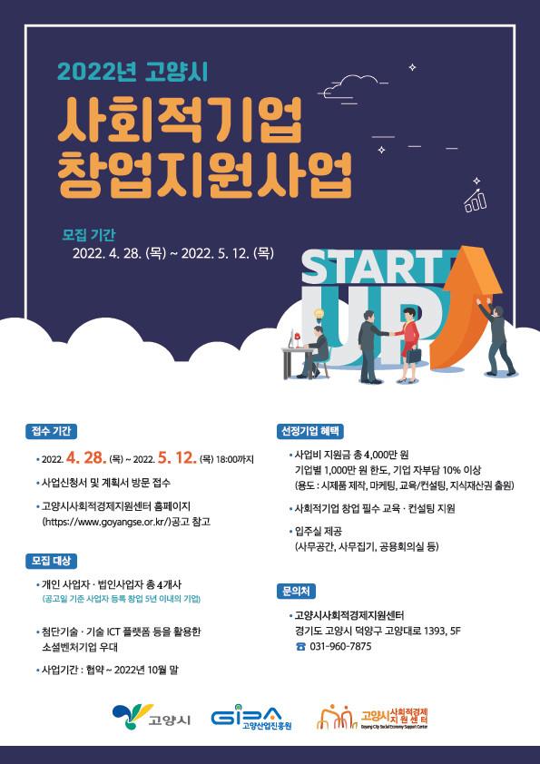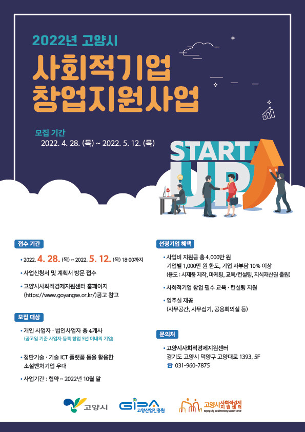[고양=이기홍 기자] ‘고양산업진흥원 고양시사회적경제지원센터(이하 지원센터)는 ’고양시 사회적기업 창업지원사업’ 참여기업을 5월 12일까지 모집한다.
