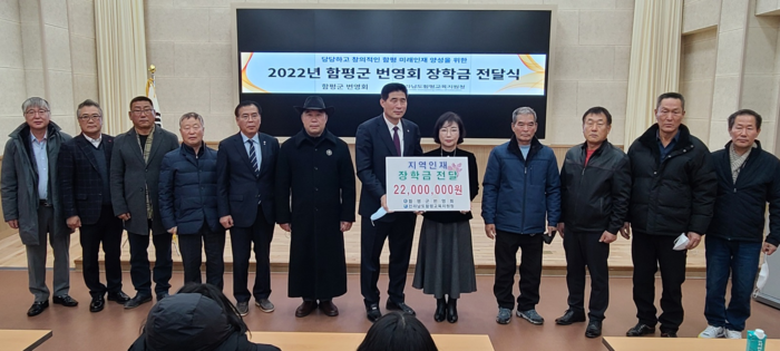 | ▲ 29일 함평군 번영회(회장 오민수)는 초·중·고·대학생 22명에게 1인당 100만원씩 총 2200만원을 장학금으로 지급했다.(출처=함평교육지원청) |