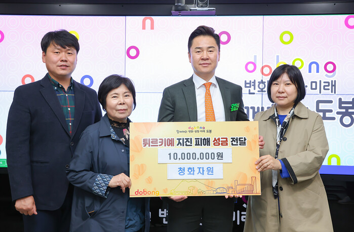 서울 도봉구가 최근 청화자원으로부터 튀르키예 지진 피해에 따른 긴급 구호 성금 1000만원을 전달받았다. 성금은 대한적십자사에 전달해 튀르키예 복구를 위해 쓰일 예정이다. 사진은 전달식에서 오언석 구청장(오른쪽 두 번째)이 관계자들과 기념촬영을 하고 있는 모습. (사진=도봉구청 제공)