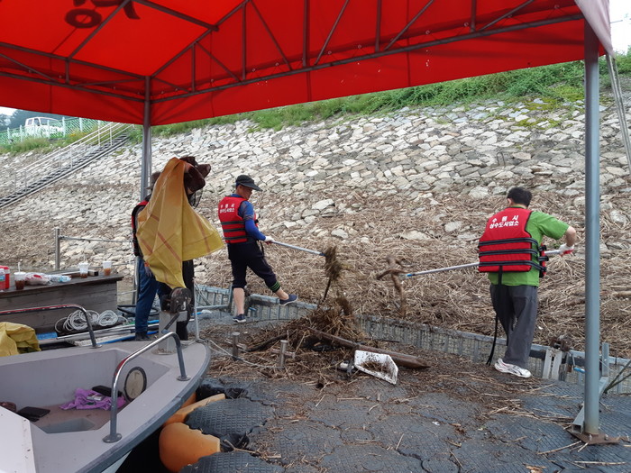 경기 수원시상수도사업소가 이달 말까지 광교저수지내 부유물(浮遊物)·쓰레기 등 폐기물을 수거해 수질 오염을 방지하고, 쾌적한 저수지 환경을 조성한다. 사진은 수원시상수도사업소 관계자들이 최근 광교저수지에서 환경정화 작업을 하고 있는 모습.(사진제공=수원시상수도사업소)