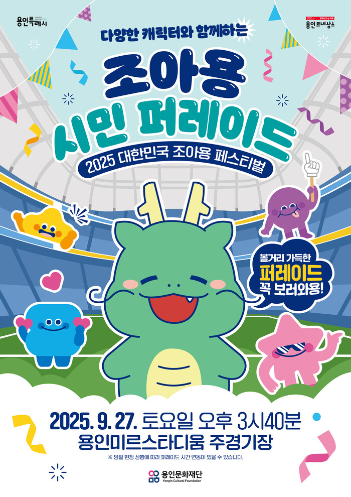 [용인=오왕석 기자] (재)용인문화재단(이사장 이상일)은 오는 9월 27일(토) 오후 3시 40분, 용인미르스타디움에서 「2025 대한민국 조아용 페스티벌 시민 퍼레이드」를 개최한다.