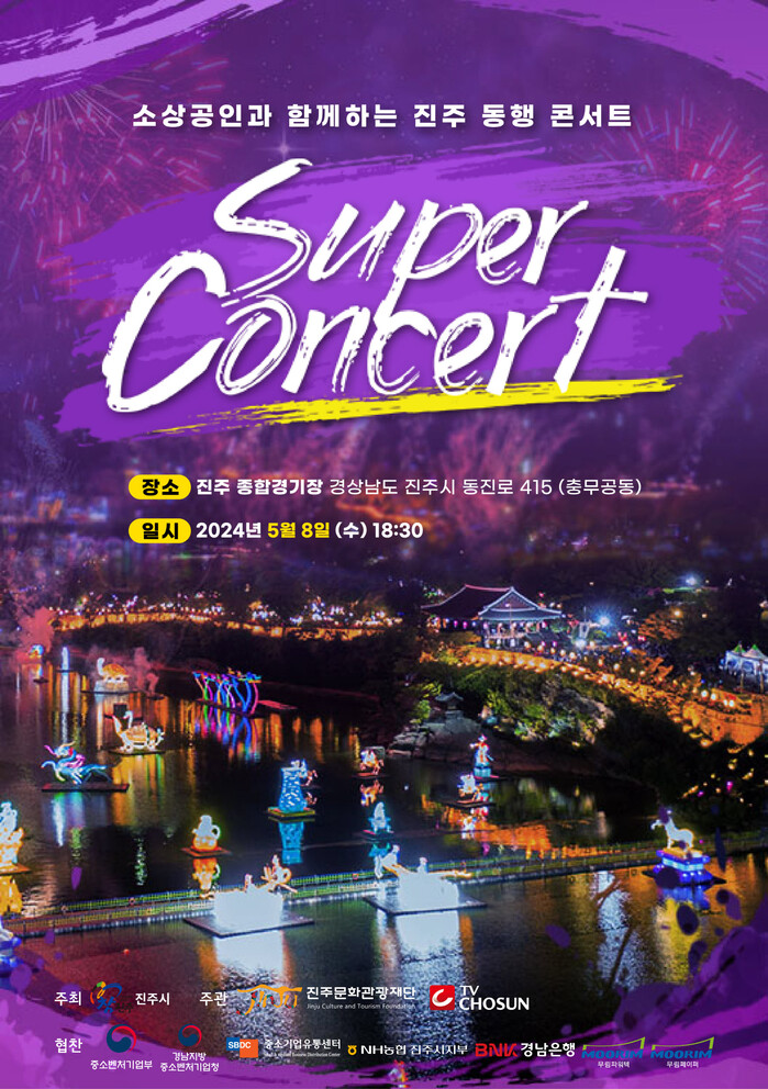진주시와 진주문화관광재단은 오는 5월 8일 오후 6시 30분‘어버이 날’을 맞아 진주종합경기장 주 경기장에서 소상공인과 함께하는 진주 동행 콘서트라는 주제로 ‘TV조선 슈퍼콘서트’를 개최한다.