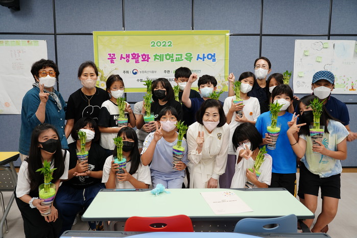 경기 양평동부청소년문화의집 청소년방과후아카데미에서는 최근 매주 목요일 특별 외부 연계 체험프로그램으로 원예 치료 프로그램인 ‘꽃 생활화 체험교육’과 청소년들의 법의식 향상을 위한 프로그램 ‘로-티즌(Law-citizen) 아카데미 교육’을 진행했다. 사진은 꽃 생활화 체험교육 참가 학생들이 기념촬영을 하는 모습.(사진제공=양평군청)