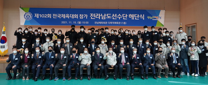 전라남도체육회(회장 김재무)는 15일 전남체육회관 다목적체육관에서 장석웅 전남교육감, 김재무 회장을 비롯해 입상학교장, 입상선수단 등이 참석한 가운데 제102회 전국체육대회 전남선수단 해단식을 개최하며 내년의 도약을 준비했다.