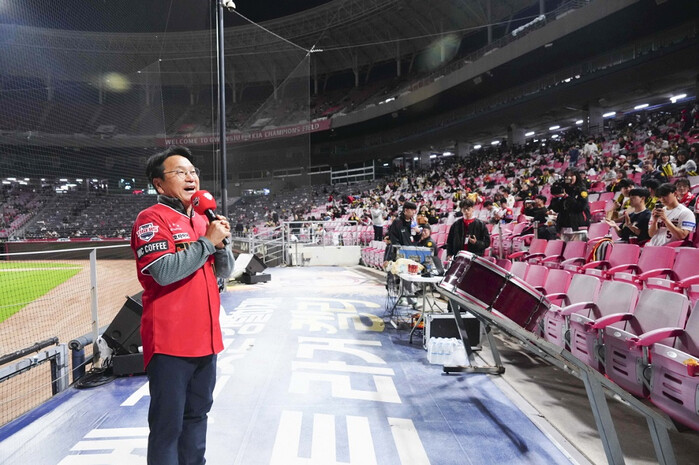 | ▲ 강기정 광주광역시장이 지난 25일 오후 광주기아챔피언스필드에서 열린 ‘한국시리즈 3차전 KIA 타이거즈와 삼성 라이온즈의 원정경기 홈 응원전’에 참석해 팬들에게 응원메시지를 전하고 있다./광주광역시 제공 |