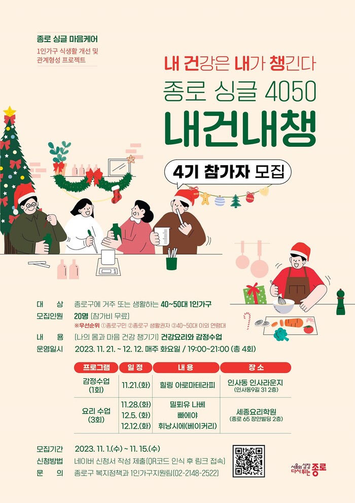 참여 대상은 종로구민 또는 관내에서 생활하는 40~50대 1인 가구다. 신청은 오는 11월 15일까지 종로구 소식지와 블로그에 게시된 포스터 QR코드(네이버폼)를 통해 받는다. 참여비는 전액 무료다. 기타 자세한 사항은 복지정책과 1인가구지원팀에서 안내한다.