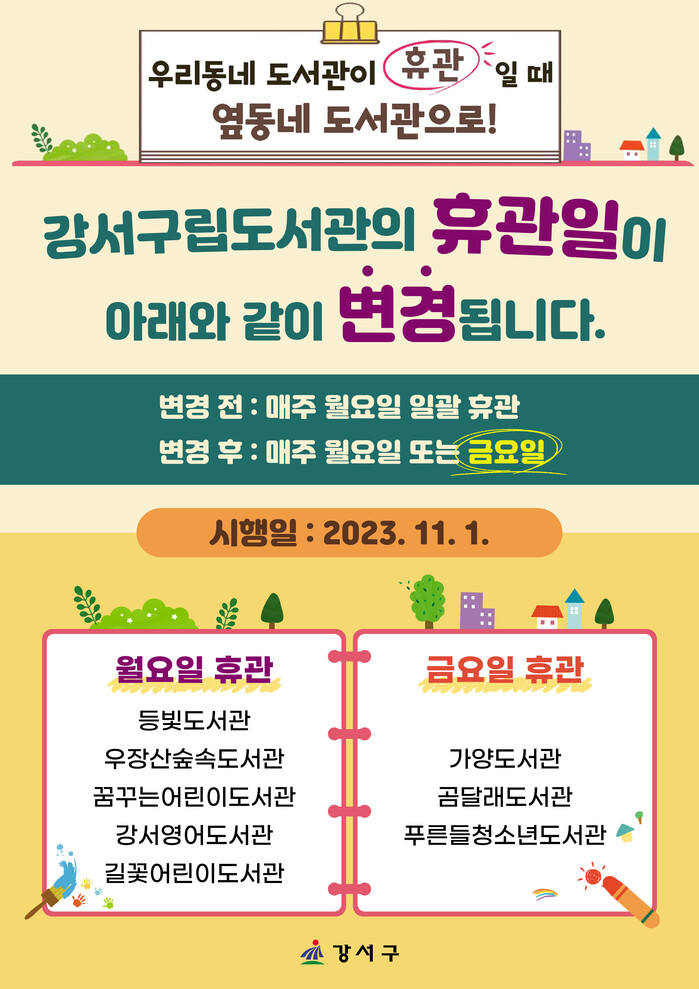 [시민일보 = 홍덕표 기자] 서울 강서구(구청장 진교훈)는 오는 11월1일부터 매주 월요일로 일괄 운영하던 강서구립도서관 총 8곳 중 3곳의 휴관일을 금요일로 변경한다고 밝혔다.
