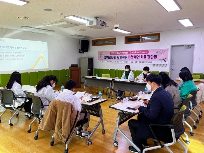 이번 간담회는 아동권리모니터링단이 올 한 해 활동을 통해 일상 속 아동권리 침해 상황의 탐색으로 도출된 개선 방안을 진주시에 전달하기 전, 정책전문가의 자문을 받아 아동참여권의 실효성을 보장하고 소통과 공감대를 형성하기 위해 마련됐다.