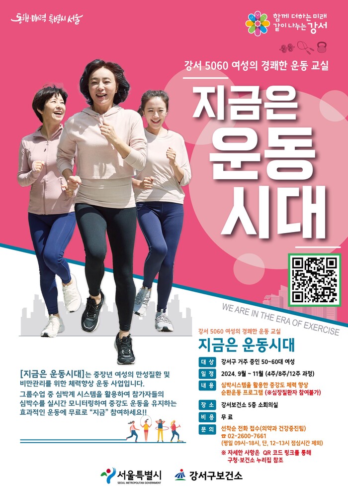 [시민일보 = 이대우 기자] 서울 강서구(구청장 진교훈)는 중장년 여성의 신체활동 증진을 위한 ‘지금은 운동시대’ 프로그램 참가자를 모집한다.