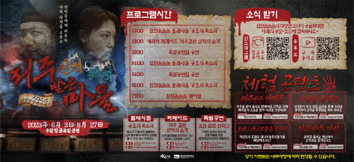 또한 매주 다른 장르의 특별 공연도 마련돼 합천영상테마파크를 방문한 관람객에게 볼거리와 즐거움을 선사할 예정이며, 그 외에도 미션을 통과한 관람객만이 즐길 수 있는 ‘호패 만들기 체험’과 ‘대나무 물총 만들기 체험’이 운영되며, 전문 분장사에게 호러 분장을 받아볼 수 있는 ‘저주받은 기방’ 유료 체험도 상시 운영 예정이다.